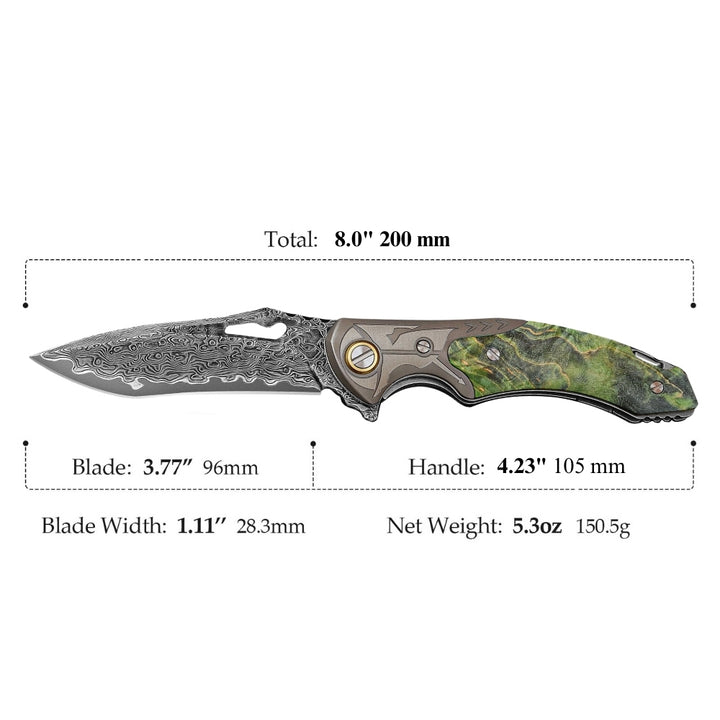 Hades Japanese VG10 Damascus Pocket Knife with Clip Stabilized Maple Burl Handle