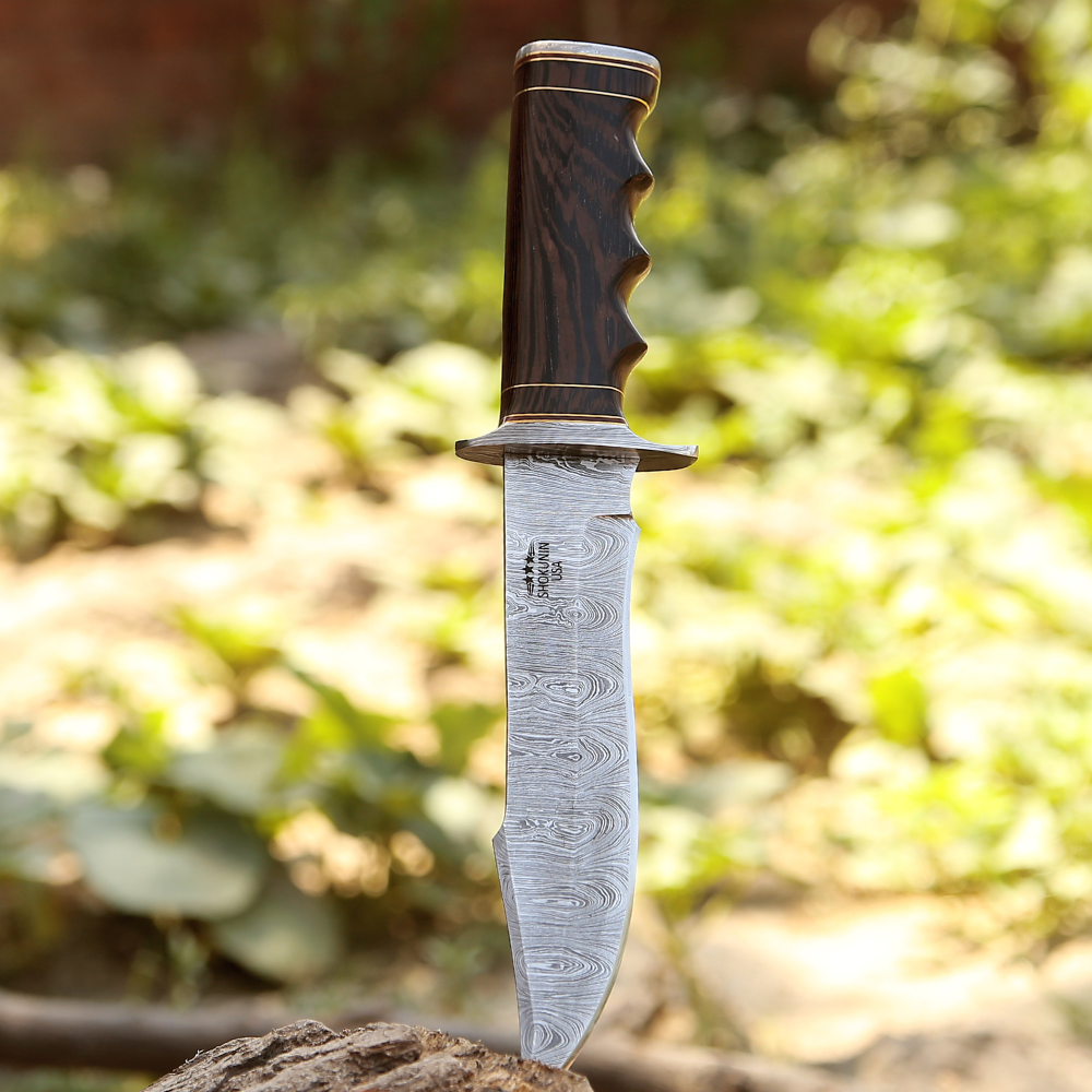 Hunting Knives - Thunderstrike Damascus Bowie Knife with Exotic Wenge Wood Handle - Shokunin USA