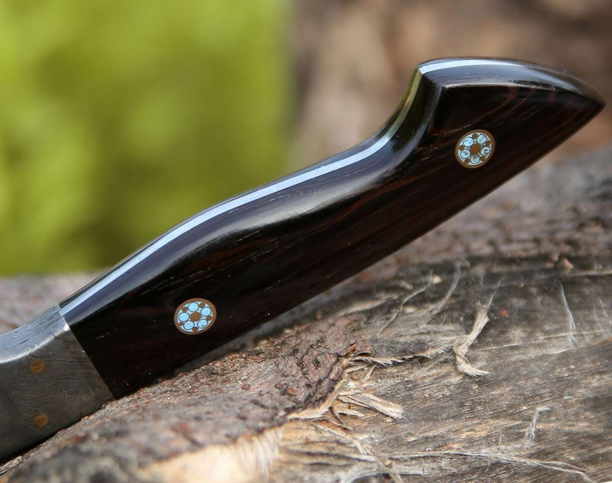 • Material: Escalera de acero de Damasco forjada a mano de 325 capas, mango de madera de wengué exótica estabilizada y altamente labrada, remache de mosaico de latón.