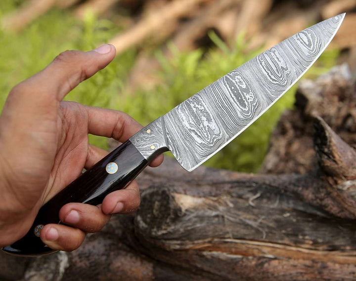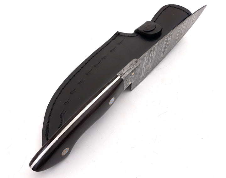 Cada cuchillo está hecho a mano con meticulosa atención al detalle, con una hoja de 6 pulgadas y un mango estabilizado de madera exótica de wengué.