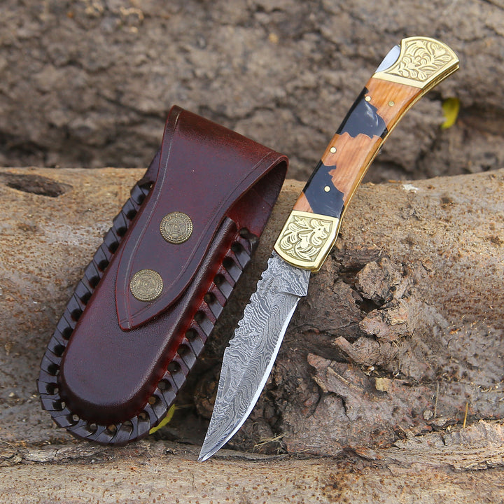 EDC Knife - Goldenbolt Handmade Damascus EDC Knife with Leather Sheath & Olive Wood Handle - Shokunin USA