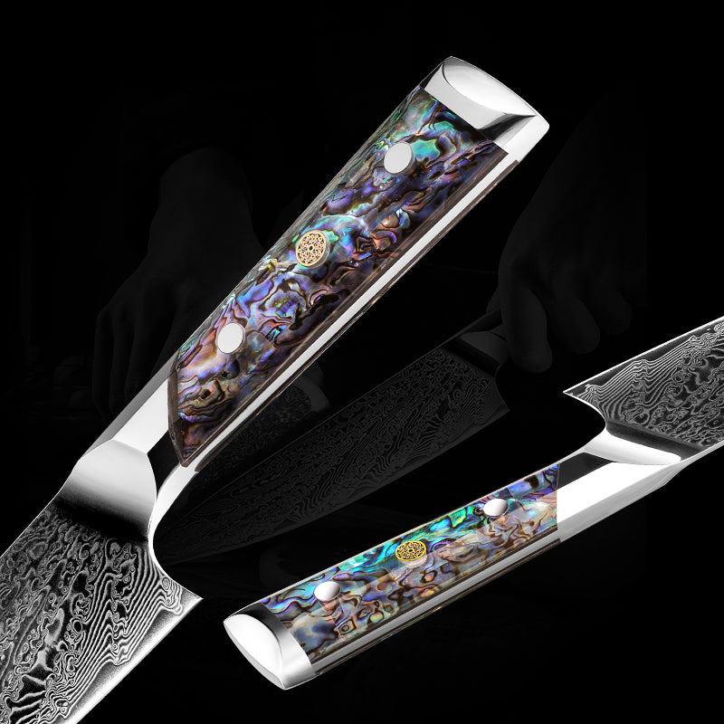 Abalone Professional Knife Set, 5 Piece, VG10 Damascus Steel Blades with Stunning Abalone Shell Handles, Brass Mosaic Pins, Custom Full Tang Fixed Blade Professional Kitchen Knives with Sheaths, Knife Sharpening, and Custom Personalization.