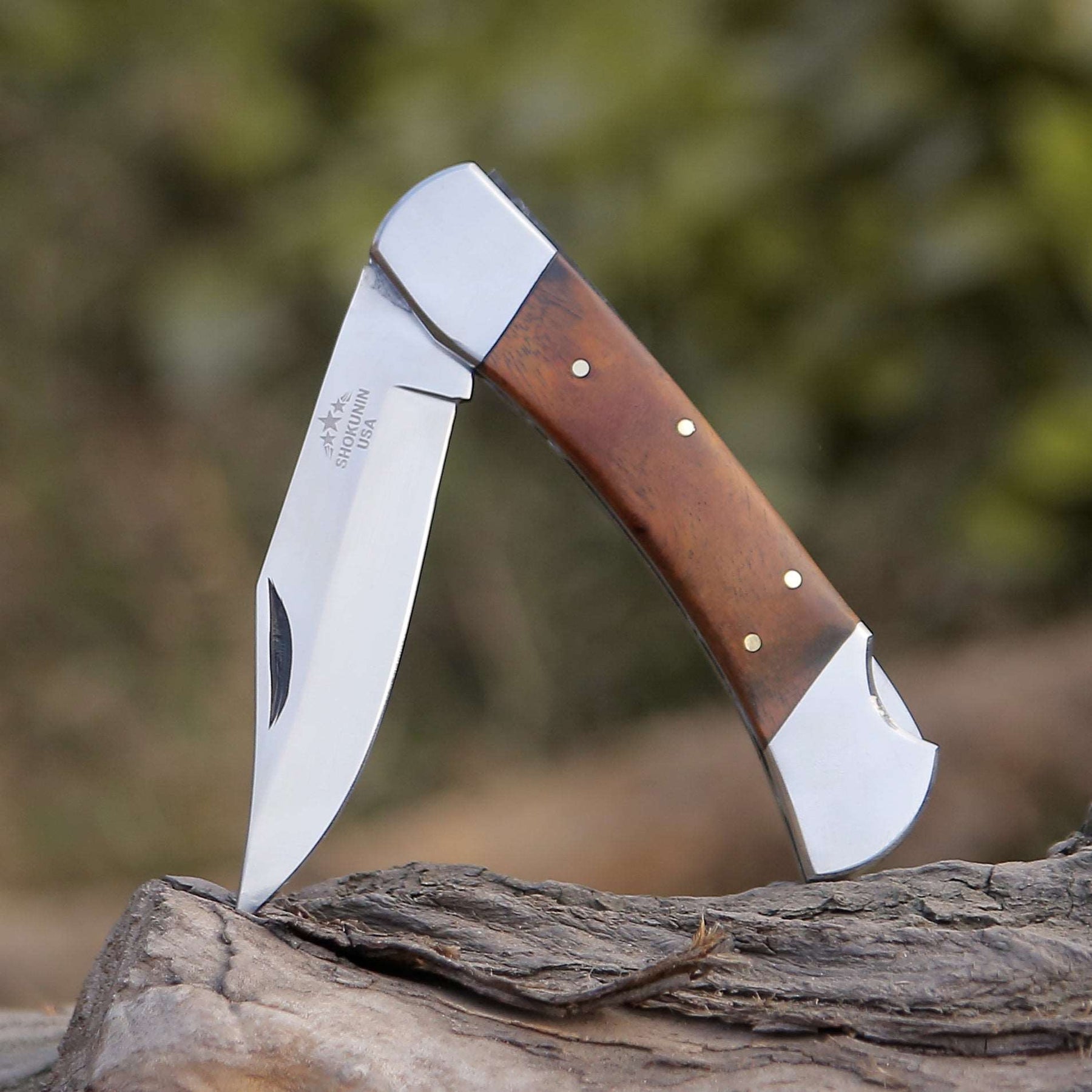 Materialien: 1095-Klinge, Rosenholzgriff, Back-Lock-Klappmesser, Lederscheide, Pro Sharpening.