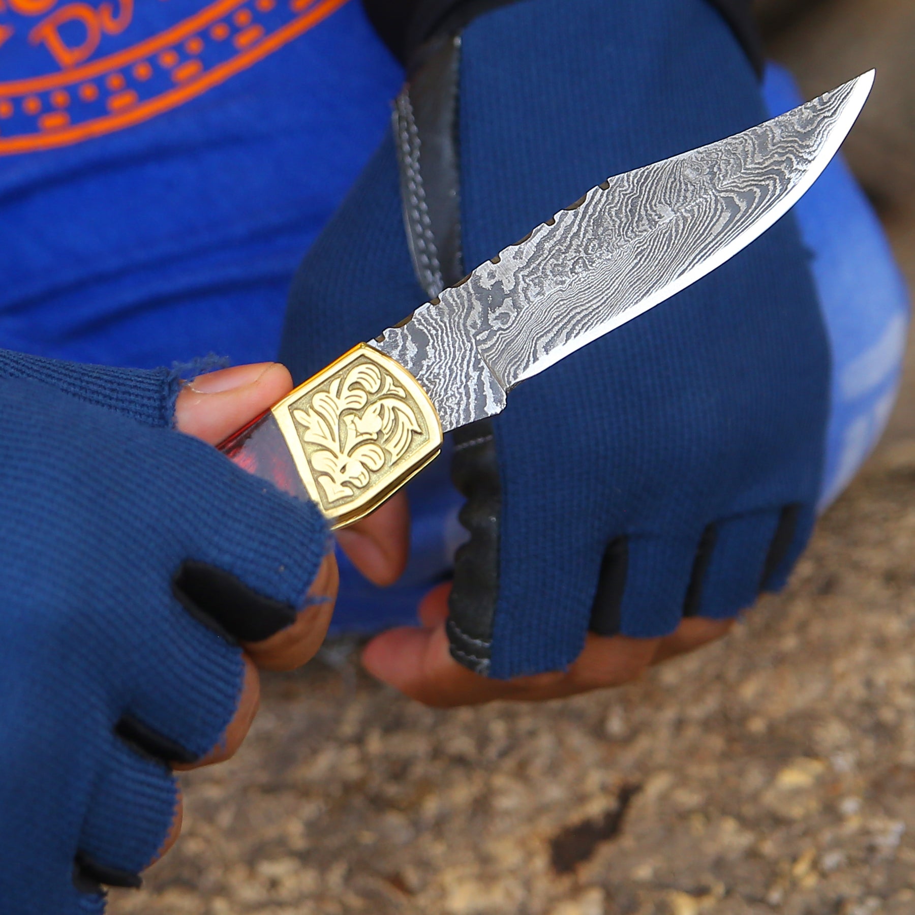 EDC Utility Knife - Edgefire Handmade Damascus EDC Utility Folding Knife with Leather Sheath & Pakka wood - Shokunin USA