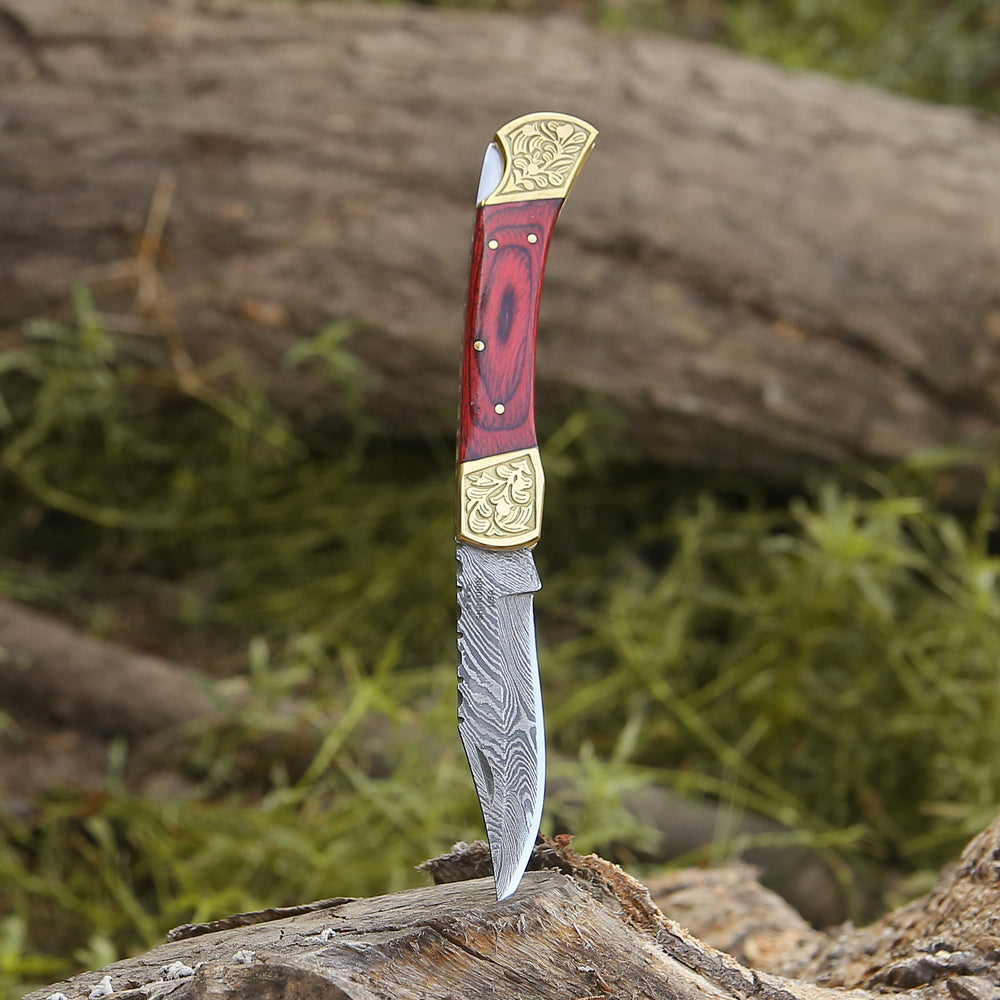 The elegant handle is made using pakkawood scales and engraved brass bolsters. It has been sealed to prevent cracking or drying and preserve the handle for lifetime comes with Back lock folding mechanism.