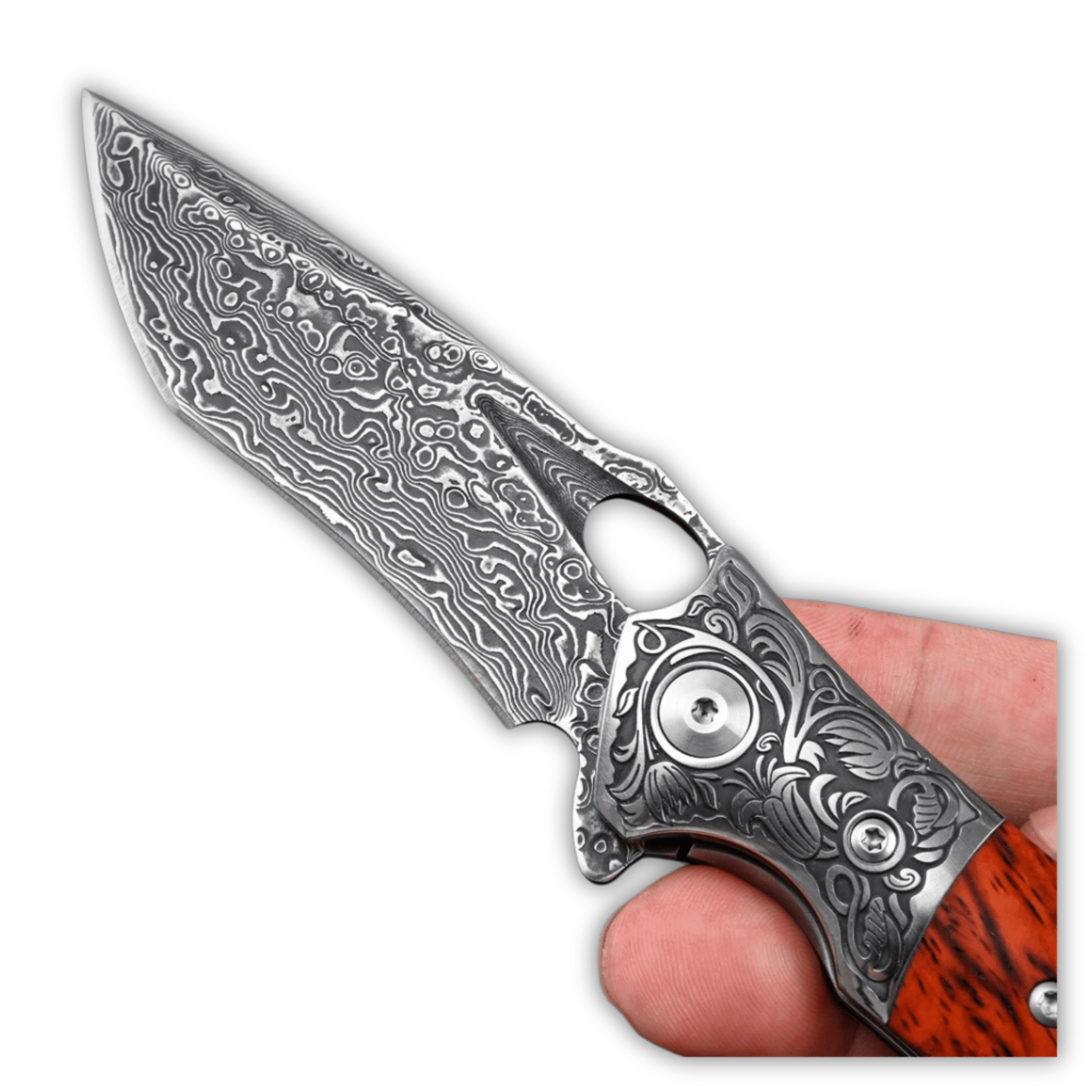 HANDGEFERTIGTES KLAPPMESSER AUS DAMASKUSSTAHL – Die Klinge wird durch Schichtung, Schweißen und Hämmern von Hand geschmiedet. Dies führt dazu, dass jede Klinge ein einzigartiges Design oder, wie manche sagen würden, einen „Fingerabdruck“ hat. Jedes einzelne Messer ist wirklich einzigartig.