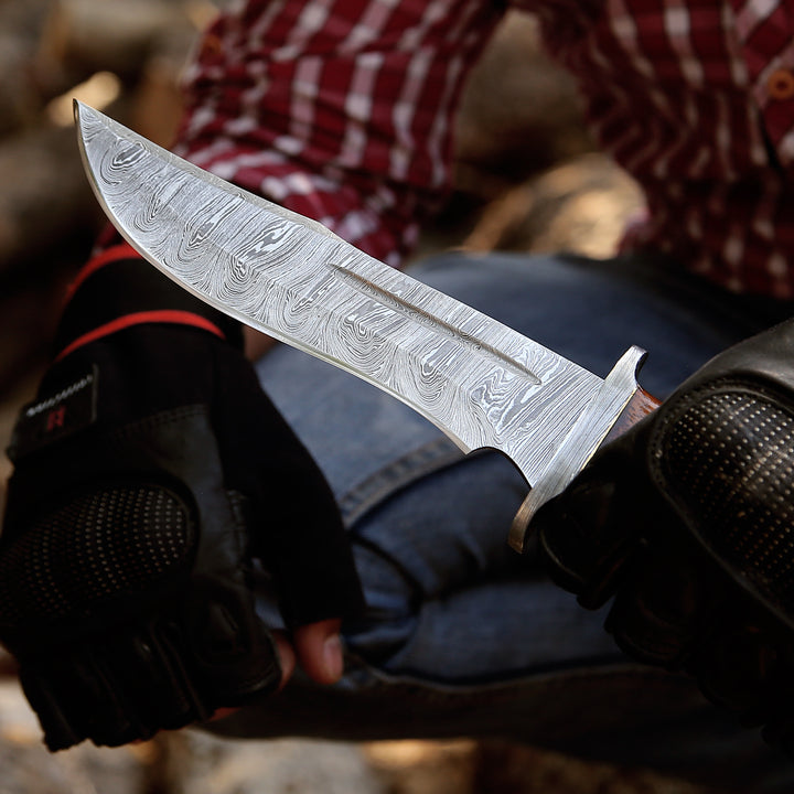 Utility Knife - Raider Damascus Steel Bowie Knife with Exotic Rose Wood Handle & Sheath - Shokunin USA