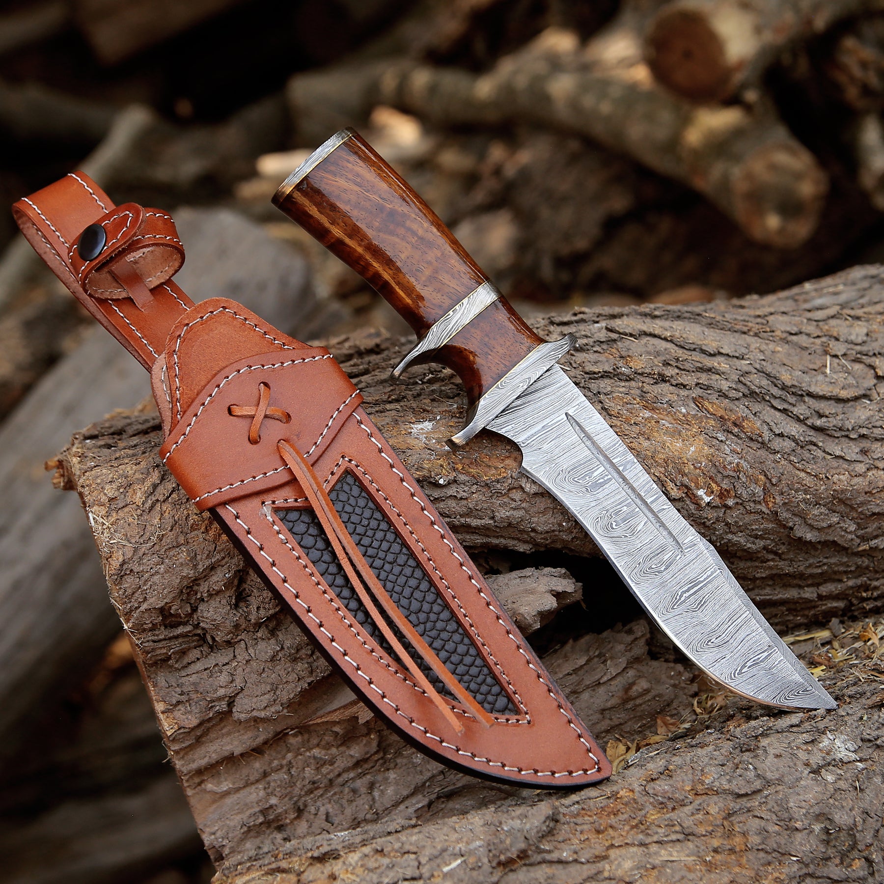 Bowiemesser aus Damaststahl, 12 Zoll, Klinge mit nachlaufender Spitze aus Damaststahl, Griff aus exotischem Rosenholz, durchgehender Erl, handgenähte Lederscheide.