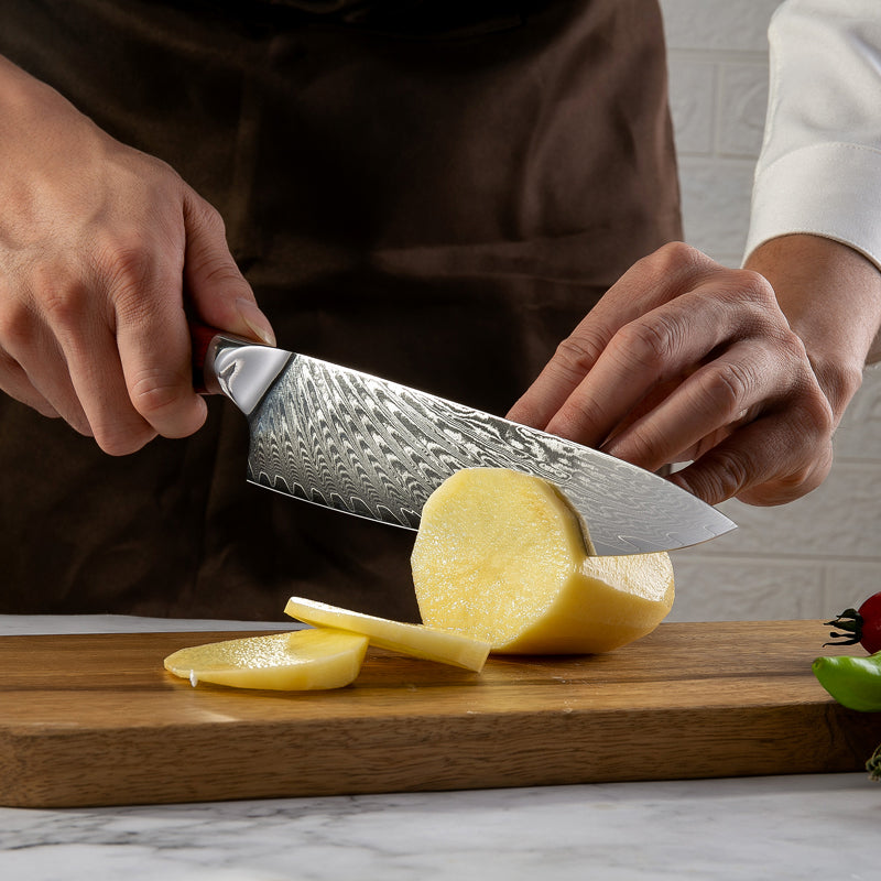VG10 Damascus steel, renowned for its robustness, is a premium choice in knife making. It serves as the core in Damascus blades, typically layered with other stainless steels for enhanced aesthetics and performance. This steel is specially treated, oil quenched at 2100°F, and rapidly cooled twice to achieve a hardness of 58 or higher on the Rockwell scale. This process not only improves strength and edge retention but also creates the distinctive patterns that make Damascus knives highly prized by chefs and collectors alike.