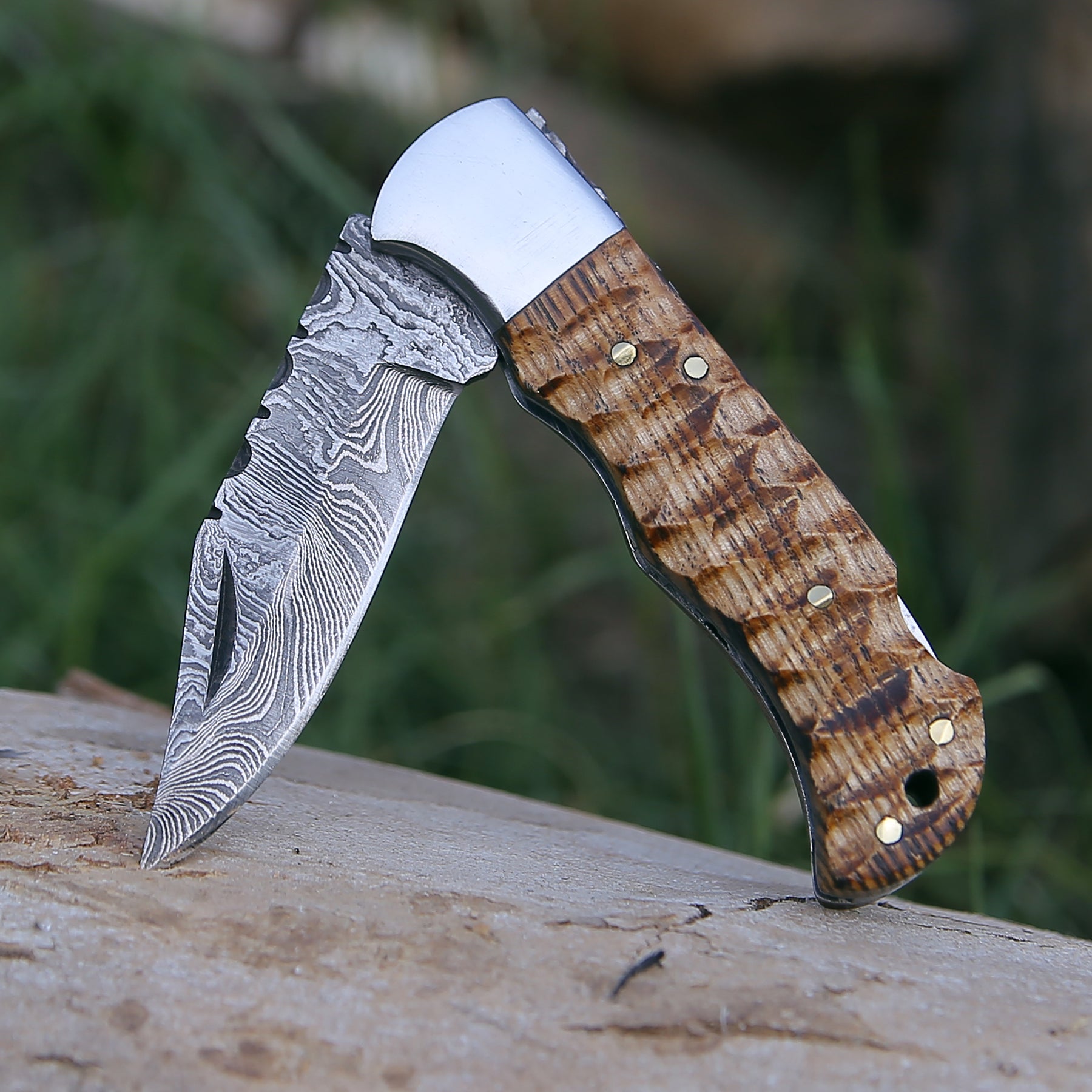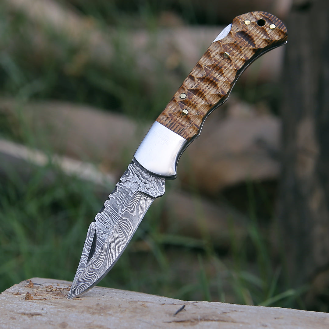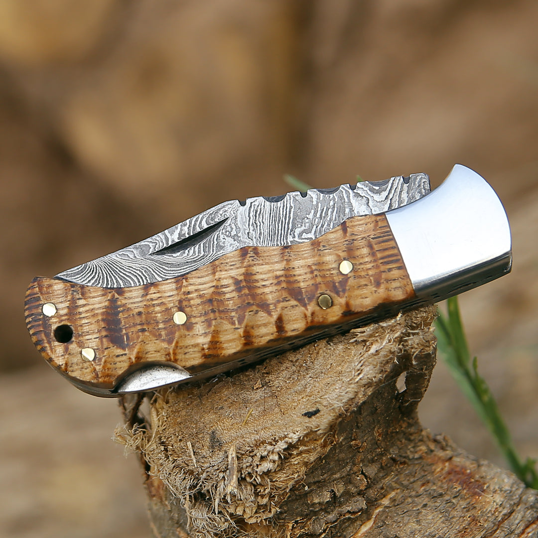 The elegant handle is made using forged & charred ash wood. It has been sealed to prevent cracking or drying, preserving the handle for a lifetime. The knife comes with a lock-back folding mechanism.